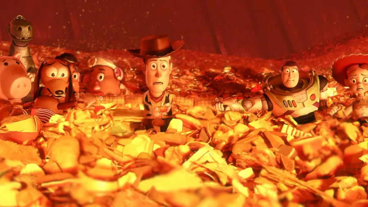 در دقایق پایانی انیمیشن داستان اسباب بازی ۳ و زمانی که شخصیت‌های اصلی از مهد کودک فرار می‌کنند، به خاطر دخالت ویلن اصلی داستان سر از کوره سوزاندن زباله‌ها درمی‌آورند. هرچند که وودی و دوستان در ابتدا فکر می‌کنند روشنایی روز را می‌بینند، اما خیلی سریع متوجه می‌شوند که به جای نور آزادی، آتش نابودی انتظارشان را می‌کشند. آن‌ها که چاره دیگری ندارند، دست در دست و با چشم‌هایی بغض‌آلود به استقبال مرگ حتمی می‌روند.
