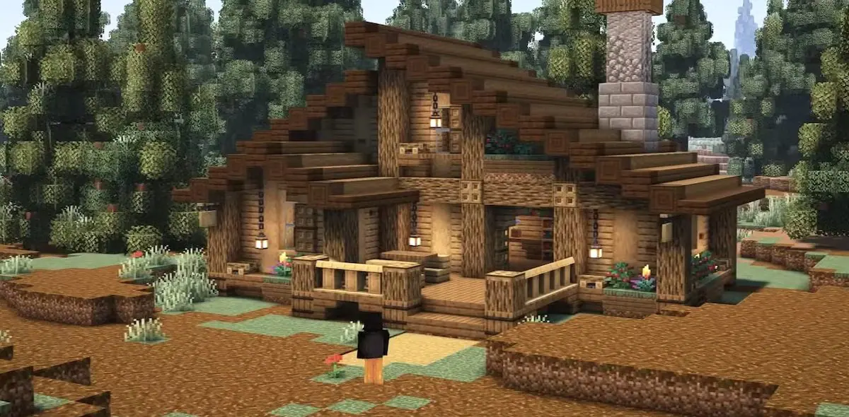 یک کلبه کلاسیک ساخته شده از تنه درخت که با یک دودکش تزیین شده است. این خانه در جنگلهای برفی یا کوهستانی بهترین نما را دارد. تراس مرتفع و نردههای دور آن باعث میشود خانه در هر بایومی (از جنگل گیلاس تا آکاسیا) بسیار شیک به نظر برسد.