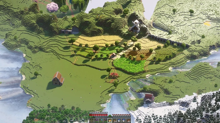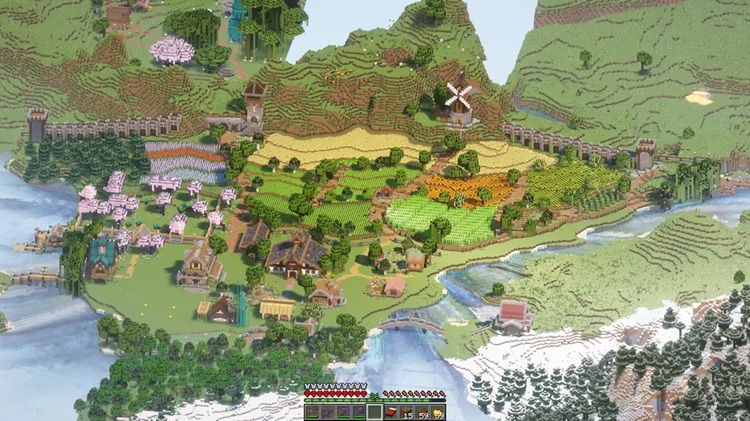 وقتی شما به تصاویر این دنیای ماینکرفت نگاه میکنید، تازه متوجه خواهید شد که این بیلدر تا چه اندازه دنیا را تکان دادهاست! این دنیا در ابتدا تنها یک کلبه کوچک، یک آسیاب و یک مزرعه کوچک داشته، اما حالا سازههای متعددی به این دنیا اضافه شده، در بخشهای شمالی شاهد یک سری دیوار و برج هستیم و حتی حالا مزارع نیز با نظم و تنوع بیشتری در کنار هم قرار گرفتهاند.