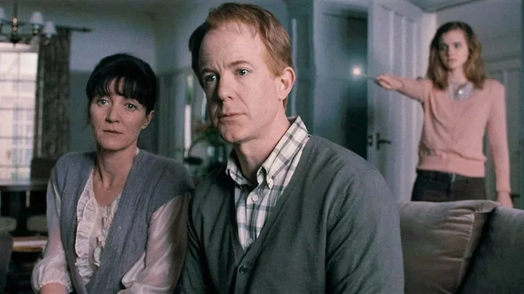 والدین هرماینی در منبع اصلی عمدتا شخصیتهایی تئوریک و غایب هستند، اما تام نایت و هیثر بلسدیل در هری پاتر و تالار اسرار و طی یک سفر پرهیاهو به «کوچه دیاگون» به آقای و خانم گرنجر جان بخشیدند. ده سال بعد، وزن احساسی هری پاتر و یادگاران مرگ: بخش ۱ برای صحنهای که در آن هرماینی خود را از خاطرات والدینش پاک میکند، نیازمند لحنی متفاوت بود. یان کلی و میشل فرلی (همان کیتلین استارک!) این نقشها را بر عهده گرفتند و به طور خاص، فرلی با حالت چهره خالی و بیروحش هنگام اثر کردن جادو، تراژدی لحظه را به خوبی به بیننده فروخت.