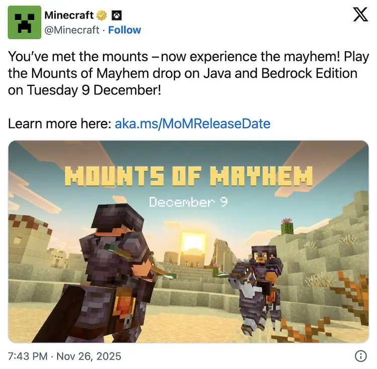 توییت رسمی اکانت ماینکرفت برای اعلام زمان انتشار آپدیت مونتز آف میهم