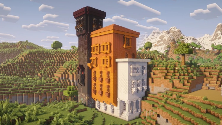 در این سازه ماینکرفت ما شاهد سه ساختمان در کنار هم هستیم که در در ارتفاعات مختلف و تنوع رنگی در کنار هم قرار گرفتهاند. البته که سازنده برای تناسب بهتر در این سازه، سعی کرده تا کمی اغراق در اختلاف بین این ساختمانها را کمتر کند و در واقع ارتفاع آنها را به هم نزدیکتر کند.