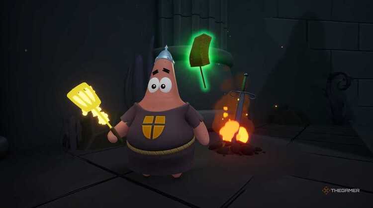 اگر به سمت شمشیر بروید، گزینه تعامل (Interact) روی صفحه ظاهر میشود. با زدن دکمه، میتوانید آتش را روشن کنید و به نظرم یکی از بزرگترین و خفنترین ارجاعات تاریخ باب اسفنجی به بازیهای ویدیویی را رقم بزنید. این موجود دریایی محبوب تا امروز در بازیهای بیشماری حضور داشته، اما بازیهای اختصاصی خودش معمولاً چهارچوب جهان باب اسفنجی را حفظ میکردند. اما به نظر میرسد در تایتانهای جزر و مد اوضاع فرق کرده است؛ راستش را بخواهید هنوز نمیدانم باید عاشق این تغییر باشم یا از آن متنفر شوم.