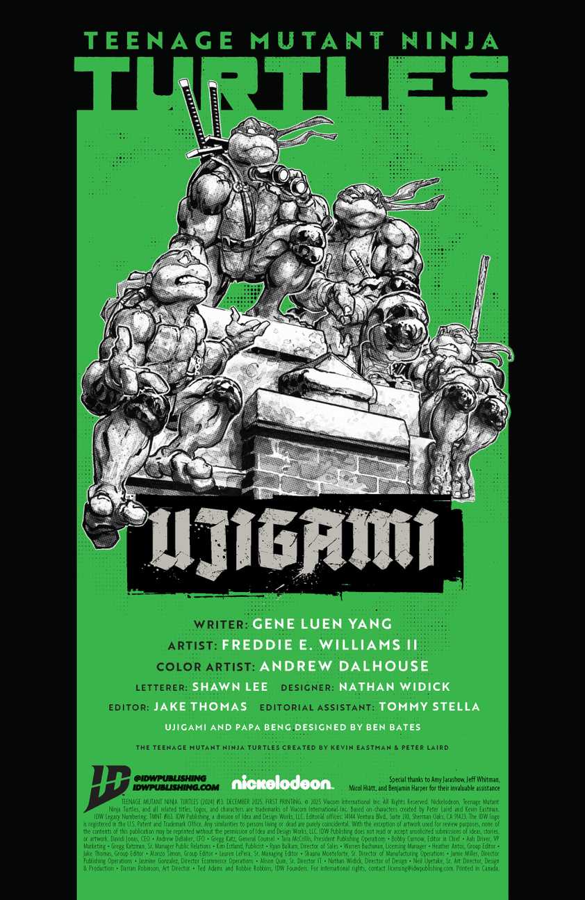 عصر جدیدی برای TMNT آغاز میشود! جین لوئن یانگ، نویسنده تحسینشده و برنده جایزه آیزنر (خالق آثاری چون چینی متولد آمریکا، آواتار: آخرین بادافزار و سوپرمن کلن را در هم میکوبد)، سکان نویسندگی TMNT را در دست میگیرد! پس از وقایع شوکهکننده شماره ۱۲، لاکپشتها با نیویورکی متفاوت روبرو میشوند… شهری که حالا به آنها به چشم قهرمان نگاه میکند! اما این جشن پیروزی کوتاهمدت خواهد بود، زیرا تهدیدهای جدیدی برای به دست گرفتن کنترل شهر صف کشیدهاند. پاپا بنگ (Papa Beng)، یاک جهشیافته، مصمم است که دامنه قدرت گروه تبهکاری خود را گسترش دهد. با این حال، او خبر ندارد که خود و دیگر دشمنان TMNT توسط یک قاتل جدید و قدرتمند تعقیب میشوند… نام او اوجیگامی (Ujigami) است!