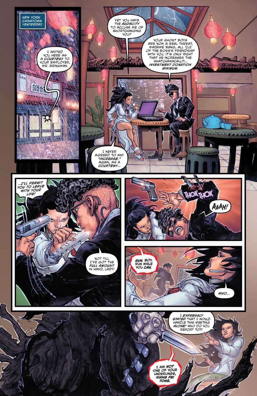 داستان این شماره با صحنهای آغاز میشود که در آن مردی مرموز به دیدار رئیس یکی از شاخههای محلی گروه تریاد (Triad) میرود. هدف او مذاکره مجدد بر سر معاملهای است که آن زن با رئیس مرموزش انجام داده بود. گفتگوی پرتنش آنها با ورود ناگهانی شرور جدید، یعنی اوجیگامی، قطع میشود. اوجیگامی که ظاهراً مانند لاکپشتها یک جهشیافته است (اما احتمال دارد ماهیتی شیطانی و اهریمنی داشته باشد)، اجازه میدهد مرد مرموز فرار کند، اما رئیس گروه گانگستری را به قتل میرساند.